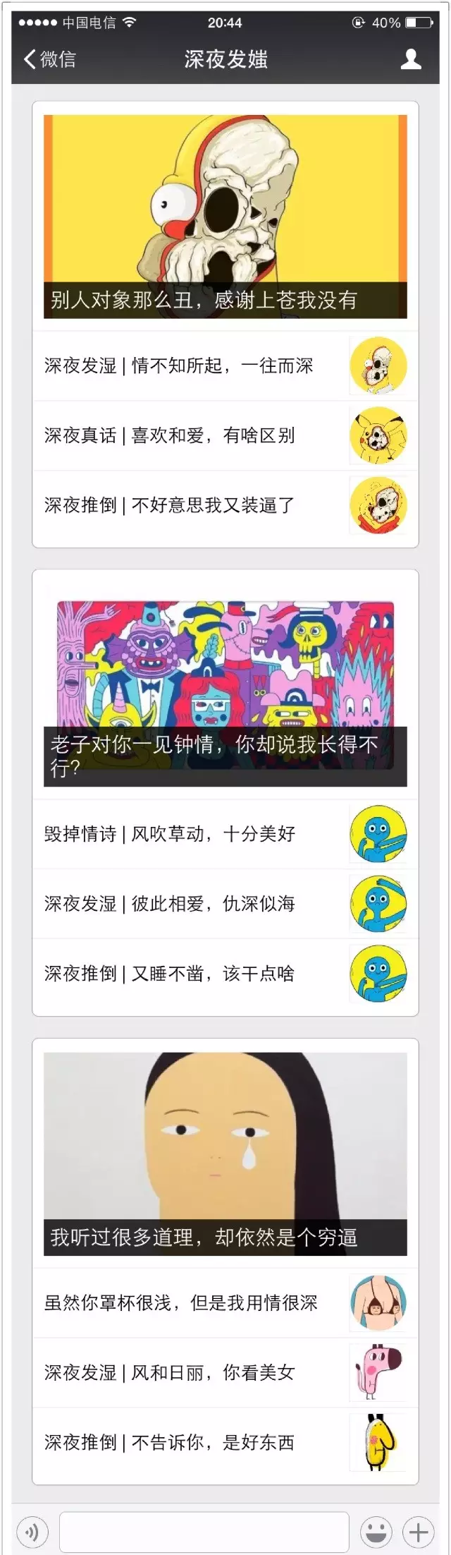 有个性吧,它把栏目做成了图标,一目了然。而且,读者将它转发到朋友圈时,我们一眼就能认出——咦,这不是那个叫微啥啥的账号嘛!
